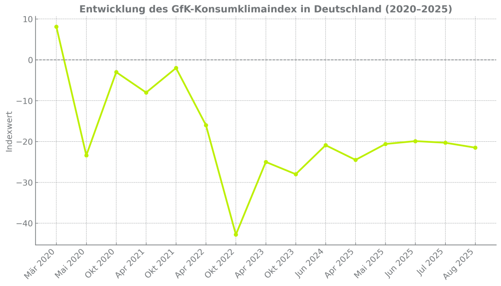 Das Konsumklima ist der zentrale Indikator für die Kaufbereitschaft privater Haushalte. Er zeigt an, ob Verbraucher*innen aktuell eher zum Konsumieren oder zum Sparen neigen. Dabei umfasst er sämtliche private Ausgaben – von Alltagskäufen und Miete über Reisen und Dienstleistungen bis hin zu großen Anschaffungen. Der GfK-Konsumklima-Index als zugehörige Kennzahl, wird monatlich von der Nürnberger Gesellschaft für Konsumforschung (GfK) und dem Nürnberg Institut für Marktentscheidungen (NIM) im Auftrag der EU-Kommission erhoben. Er basiert laut NIM auf der Befragung von rund 2.000 Personen, welche sich zur Einkommenserwartung ihres Haushalts in den nächsten 12 Monaten, zur aktuellen persönlichen Sparneigung sowie Anschaffungsneigung äußern. Der Gesamtindex dient schließlich als Frühindikator für die zukünftige Konsum- und Wirtschafts-entwicklung und liefert ein klares Stimmungsbild der deutschen Verbraucher*innen. Während ein negativer Wert Pessimismus und Unsicherheit signalisiert (etwa durch Krisen) und als Konjunkturbremse gilt, deutet ein positiver Wert auf Zuversicht und wirtschaftlichen Aufschwung hin.